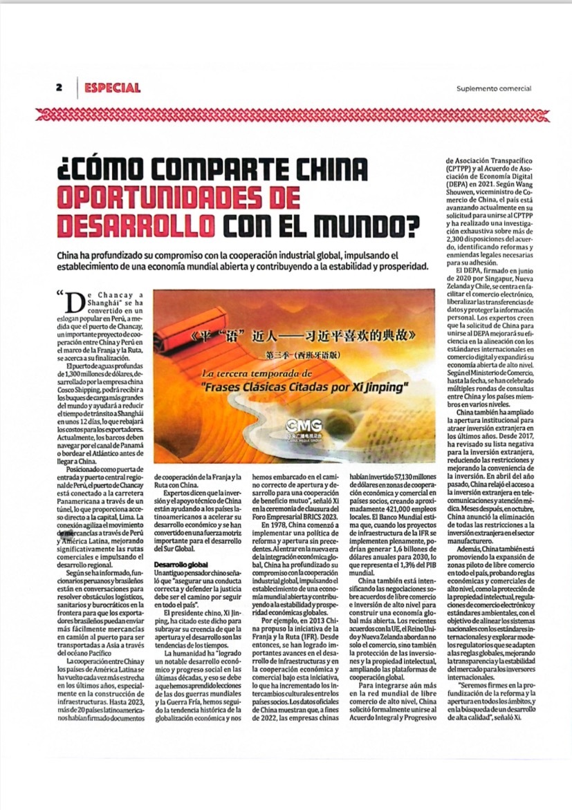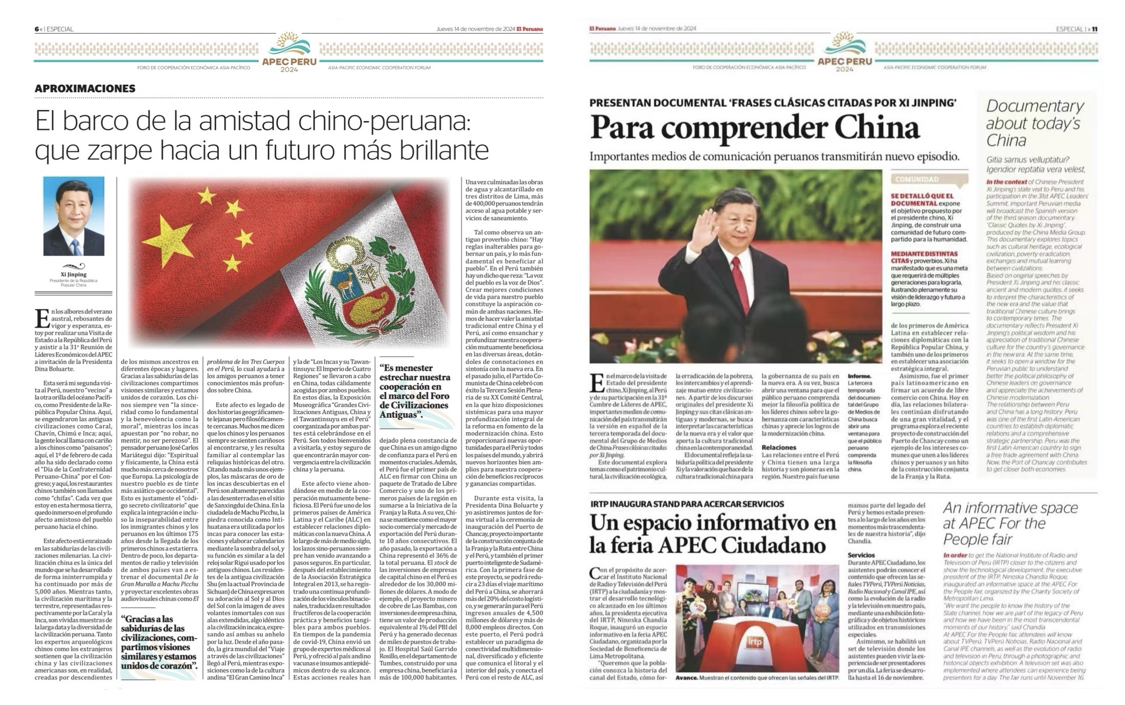 11月14日,秘魯最具影響力的官方報紙《秘魯人報》刊發節目在秘魯落播的消息。文章指出,《平“語”近人——習(xi) 近平喜歡的典故》第三季展現了中華民族開放包容、兼收並蓄的文化胸懷,闡釋了習(xi) 近平主席提出的推動構建人類命運共同體(ti) 的這一重大理念,是對“建設一個(ge) 什麽(me) 樣的世界、怎樣建設這個(ge) 世界”給出的中國方案。《秘魯人報》特刊整版刊發《平“語”近人——習(xi) 近平喜歡的典故》第三季(西班牙語版)將在秘魯主流媒體(ti) 落播特稿。《秘魯人報》官網也同步刊發了節目預告消息和海報。