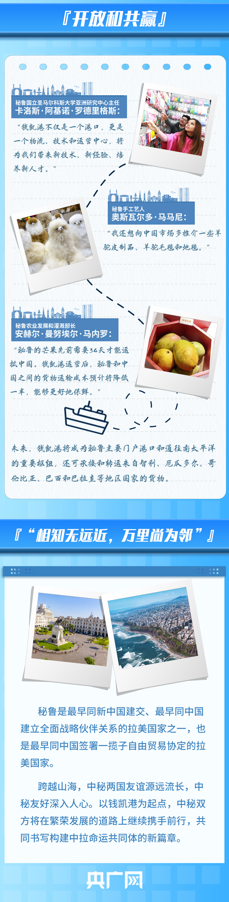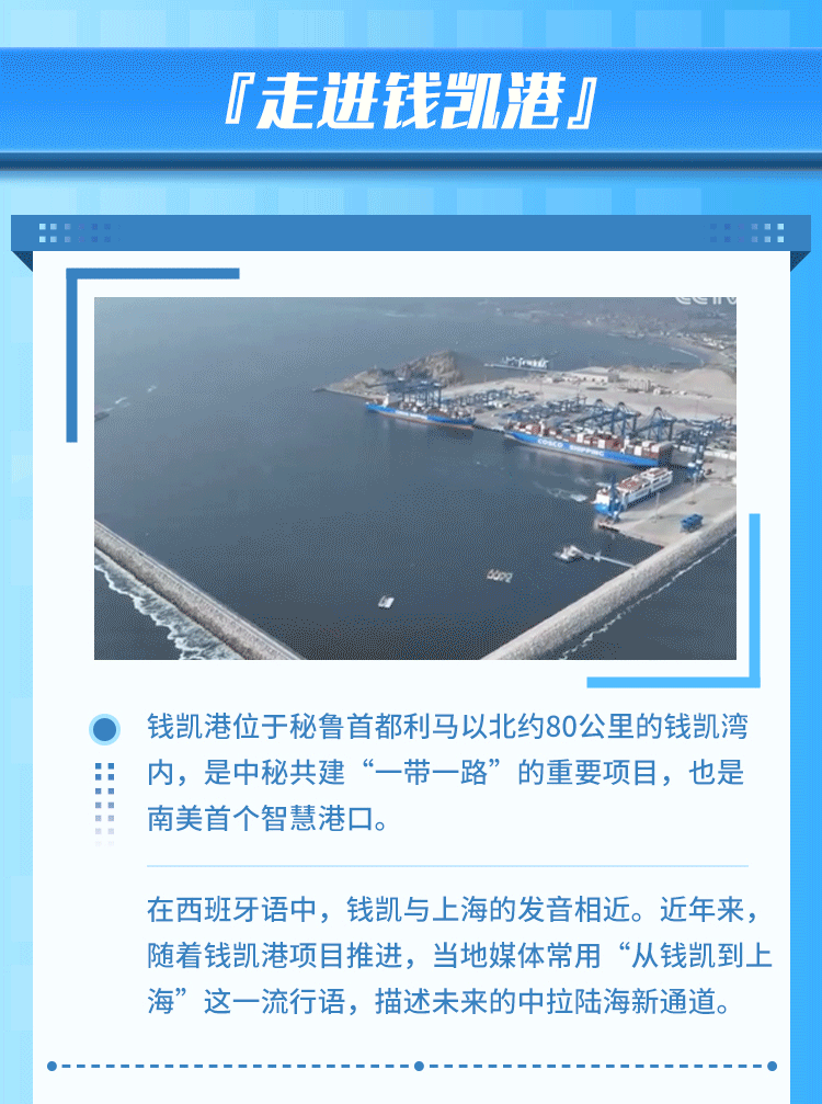錢凱港位於(yu) 秘魯首都利馬以北80公裏,是中秘共建“一帶一路”重點項目。開港後,中秘間單程海運時間將縮短至23天,節約20%以上的物流成本,每年將為(wei) 秘魯創造逾8000個(ge) 直接就業(ye) 機會(hui) 。