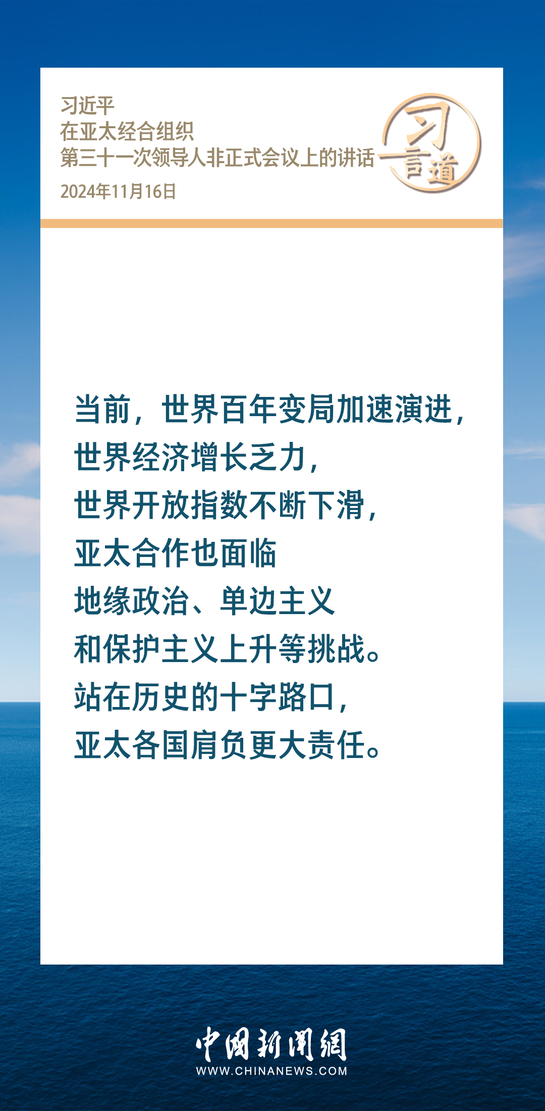 當地時間11月16日,國家主席習(xi) 近平出席亞(ya) 太經合組織第三十一次領導人非正式會(hui) 議並發表重要講話。習(xi) 近平指出——