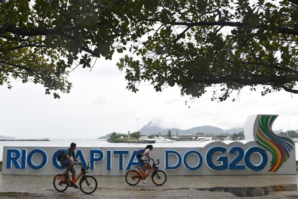 11月16日,在巴西裏約熱內(nei) 盧,人們(men) 騎車經過二十國集團領導人峰會(hui) 舉(ju) 辦地附近的峰會(hui) 標識。新華社發(盧西奧·塔沃拉攝)