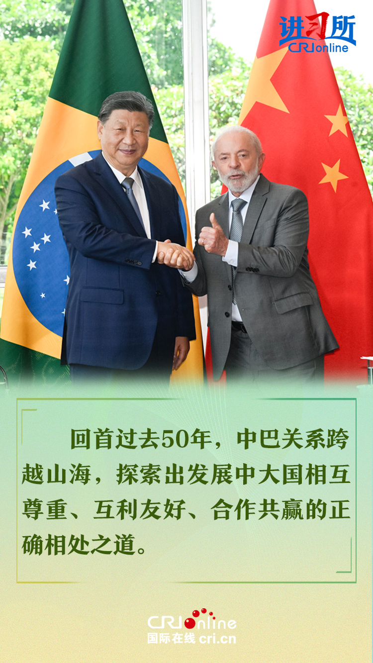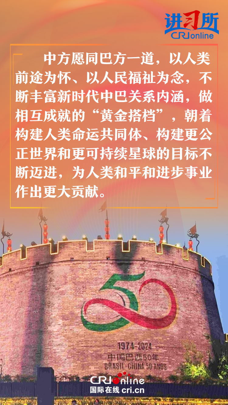 今年是中巴建交50周年。習(xi) 近平指出,回首過去50年,中巴關(guan) 係跨越山海,探索出發展中大國相互尊重、互利友好、合作共贏的正確相處之道。中方願同巴方一道,以人類前途為(wei) 懷、以人民福祉為(wei) 念,不斷豐(feng) 富新時代中巴關(guan) 係內(nei) 涵,做相互成就的“黃金搭檔”,朝著構建人類命運共同體(ti) 、構建更公正世界和更可持續星球的目標不斷邁進,為(wei) 人類和平和進步事業(ye) 作出更大貢獻。