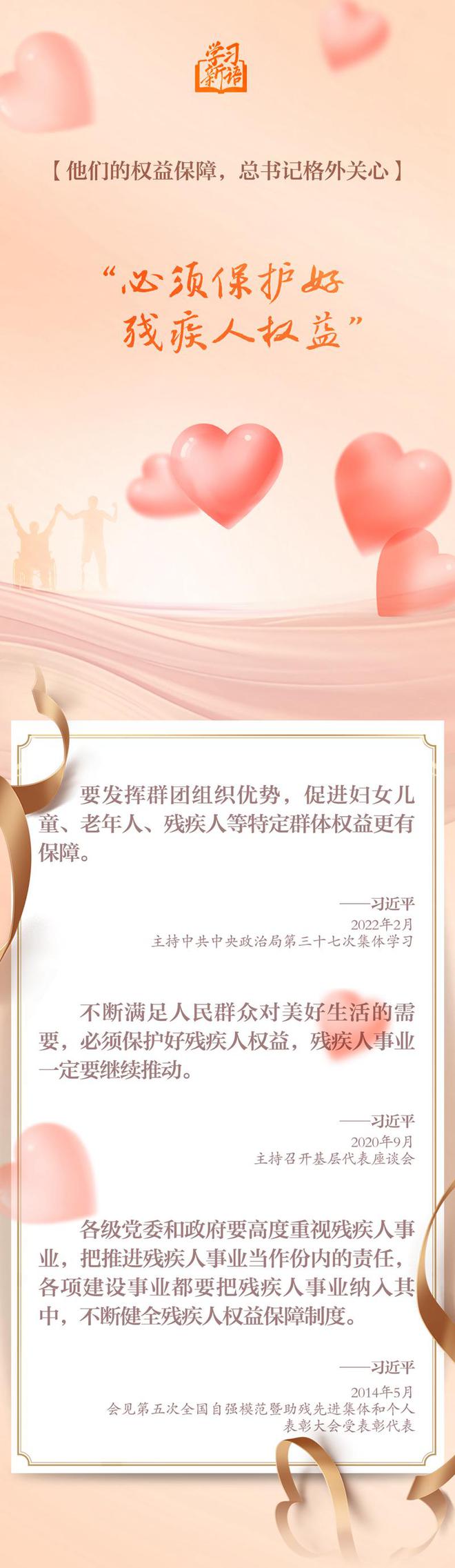 我國有8500萬(wan) 殘疾人。在習(xi) 近平總書(shu) 記心中,殘疾人是一個(ge) 特殊困難的群體(ti) ,需要格外關(guan) 心、格外關(guan) 注。總書(shu) 記的一句句溫暖話語、一次次深情囑托,讓廣大殘疾人心田滋潤、滿懷希望。