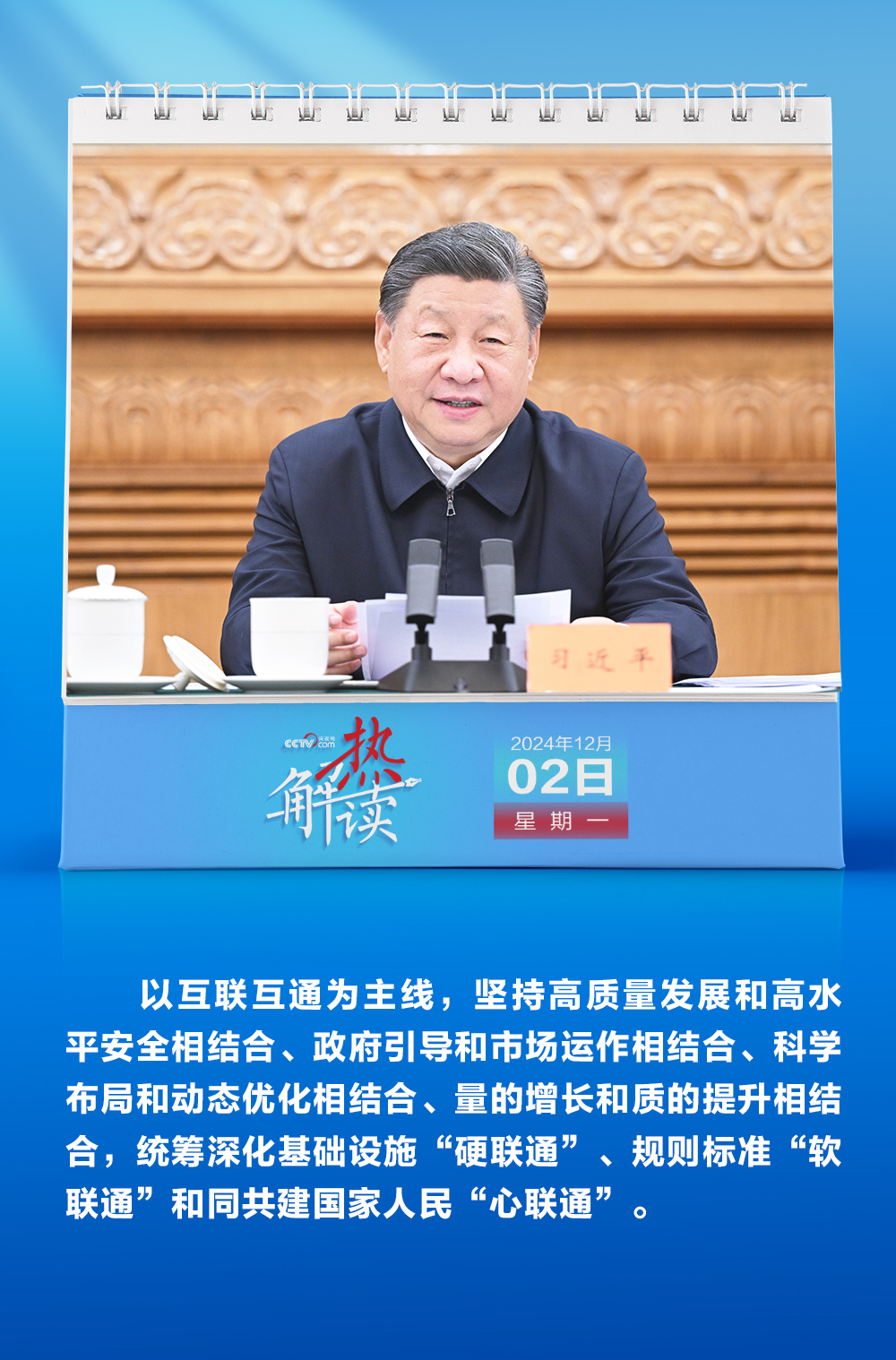 “統籌深化基礎設施‘硬聯通’、規則標準‘軟聯通’和同共建國家人民‘心聯通’”,“完善‘硬聯通’、‘軟聯通’、‘心聯通’協調推進機製”。12月2日,習(xi) 近平總書(shu) 記在第四次“一帶一路”建設工作座談會(hui) 上對深化三個(ge) “聯通”再作部署。