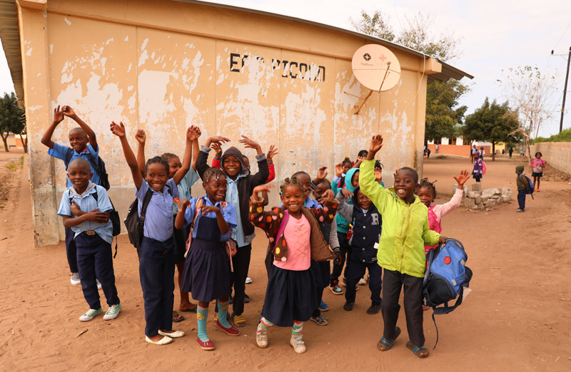 △ 當地時間2023年7月25日,莫桑比克馬普托省皮科科村學校的孩子們(men) 站在裝有中國援助的衛星電視接收天線的房屋前。