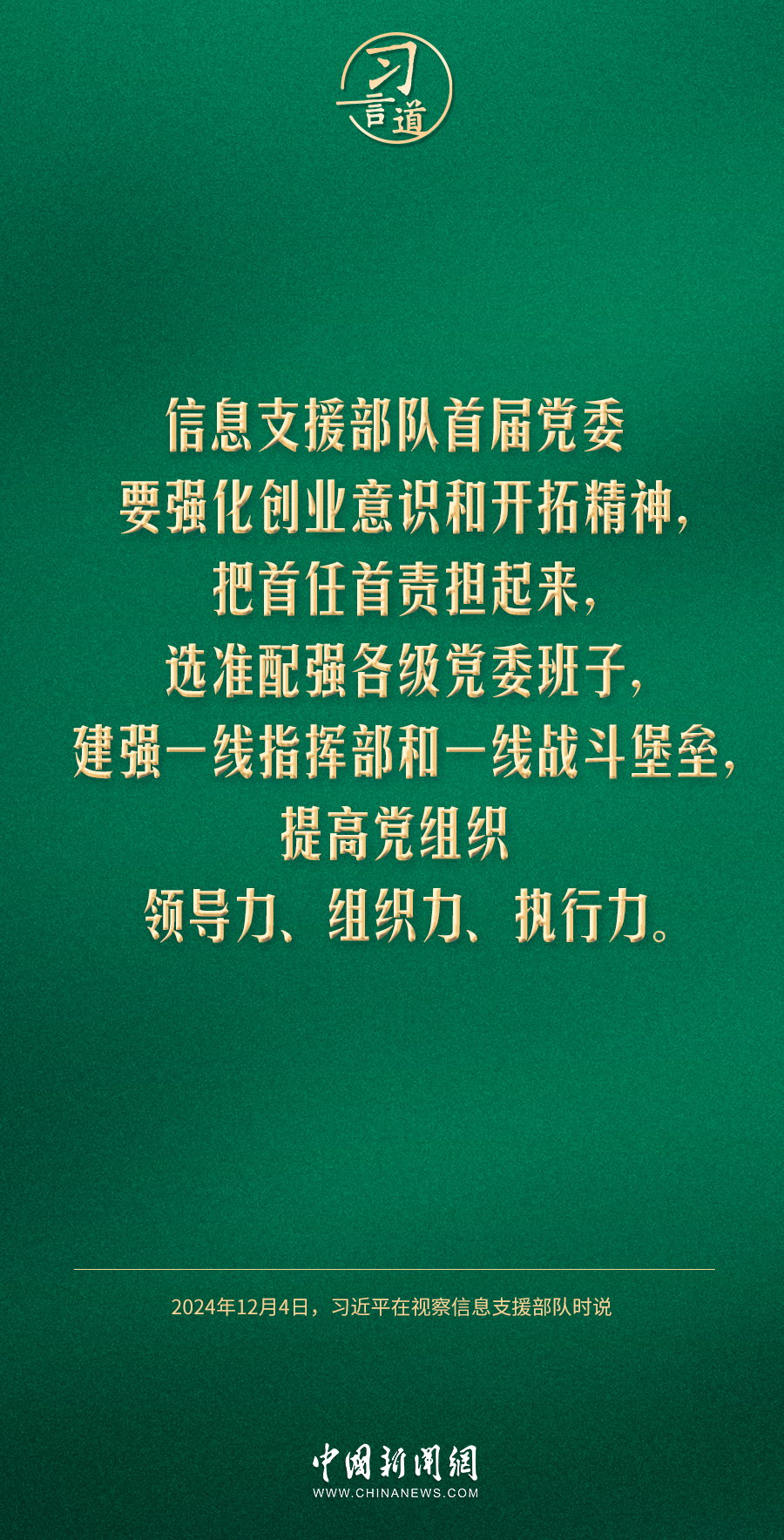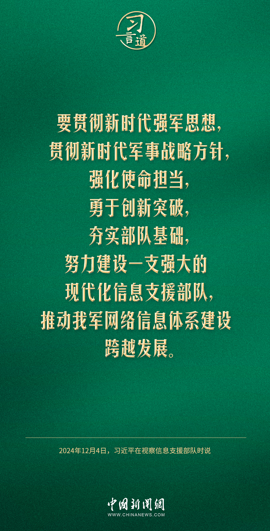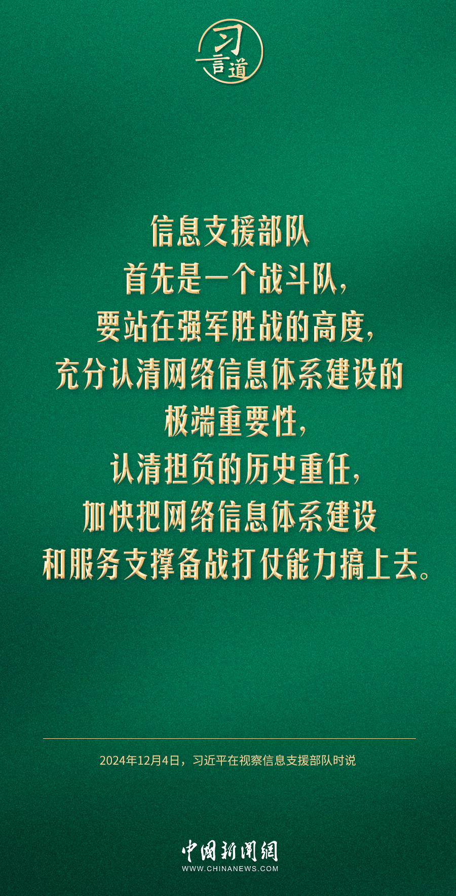 中共中央總書(shu) 記、國家主席、中央軍(jun) 委主席習(xi) 近平4日視察信息支援部隊,代表黨(dang) 中央和中央軍(jun) 委,對信息支援部隊第一次黨(dang) 代表大會(hui) 的召開表示熱烈祝賀,向信息支援部隊全體(ti) 官兵致以誠摯問候。習(xi) 近平指出——