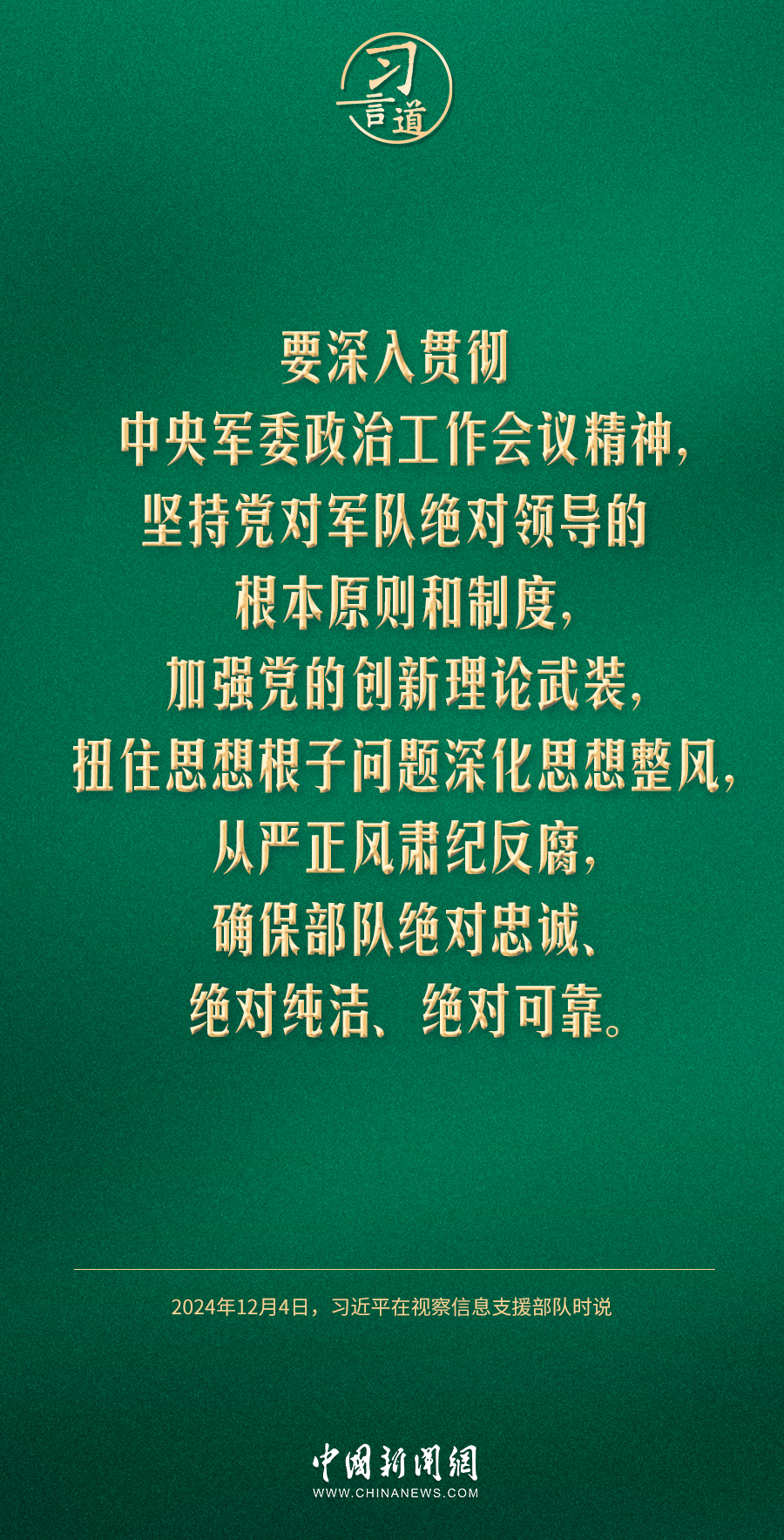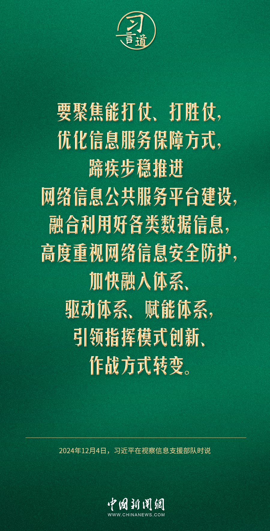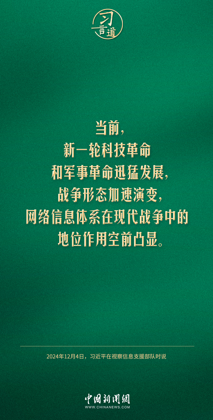 中共中央總書(shu) 記、國家主席、中央軍(jun) 委主席習(xi) 近平4日視察信息支援部隊,代表黨(dang) 中央和中央軍(jun) 委,對信息支援部隊第一次黨(dang) 代表大會(hui) 的召開表示熱烈祝賀,向信息支援部隊全體(ti) 官兵致以誠摯問候。習(xi) 近平指出——