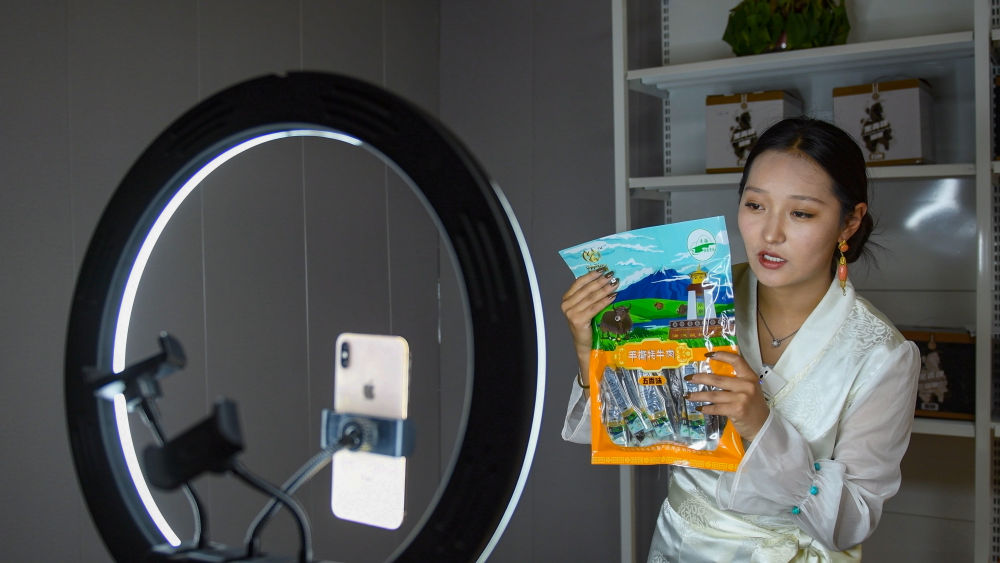 9月24日,果洛藏貢麻村村民多傑吉在進行網絡帶貨直播。(潘彬彬 攝)