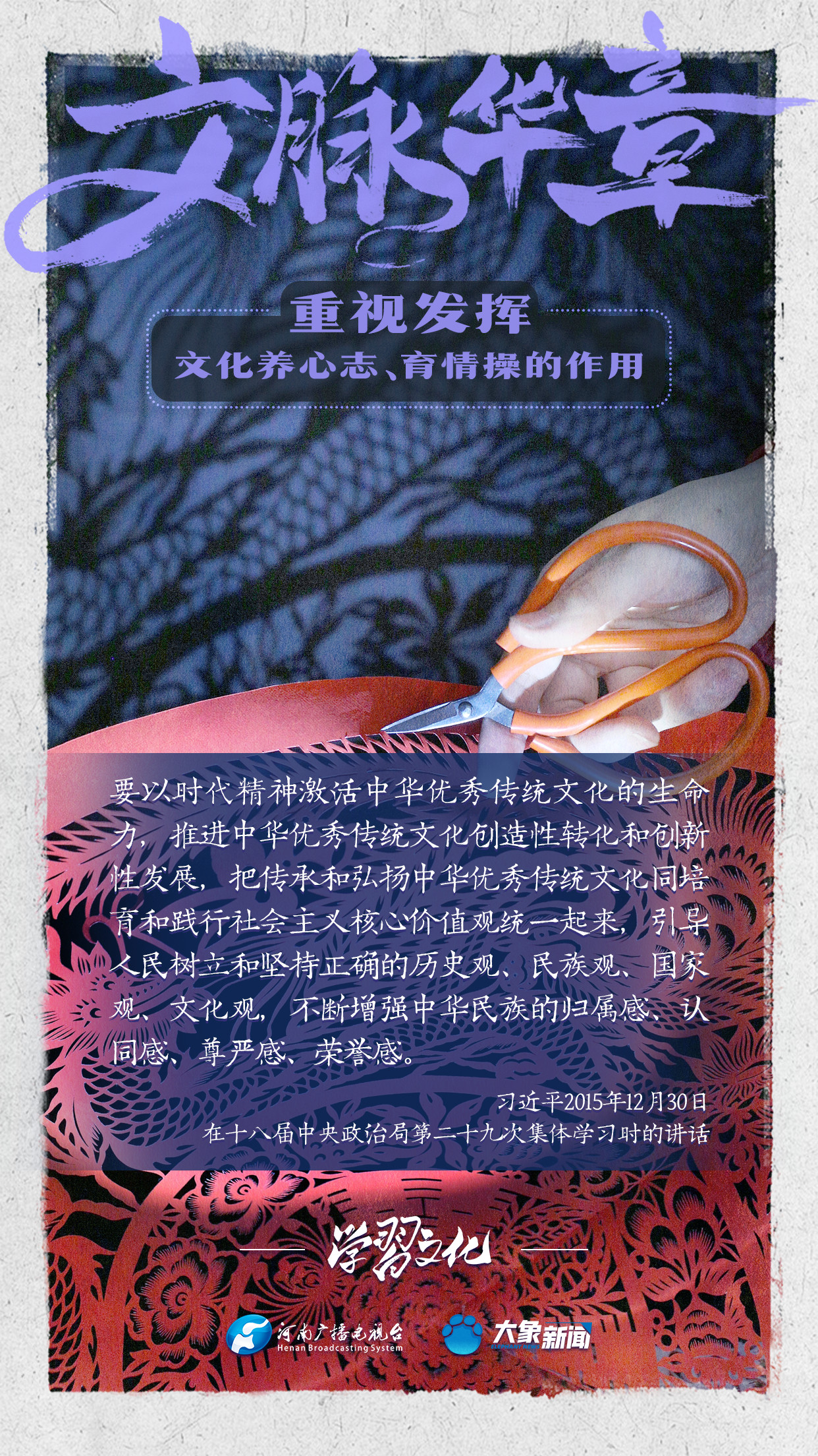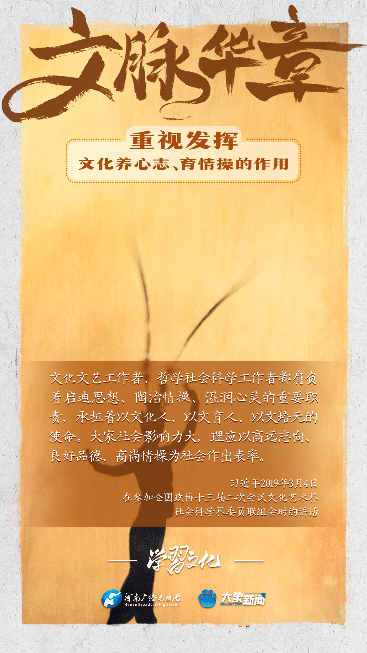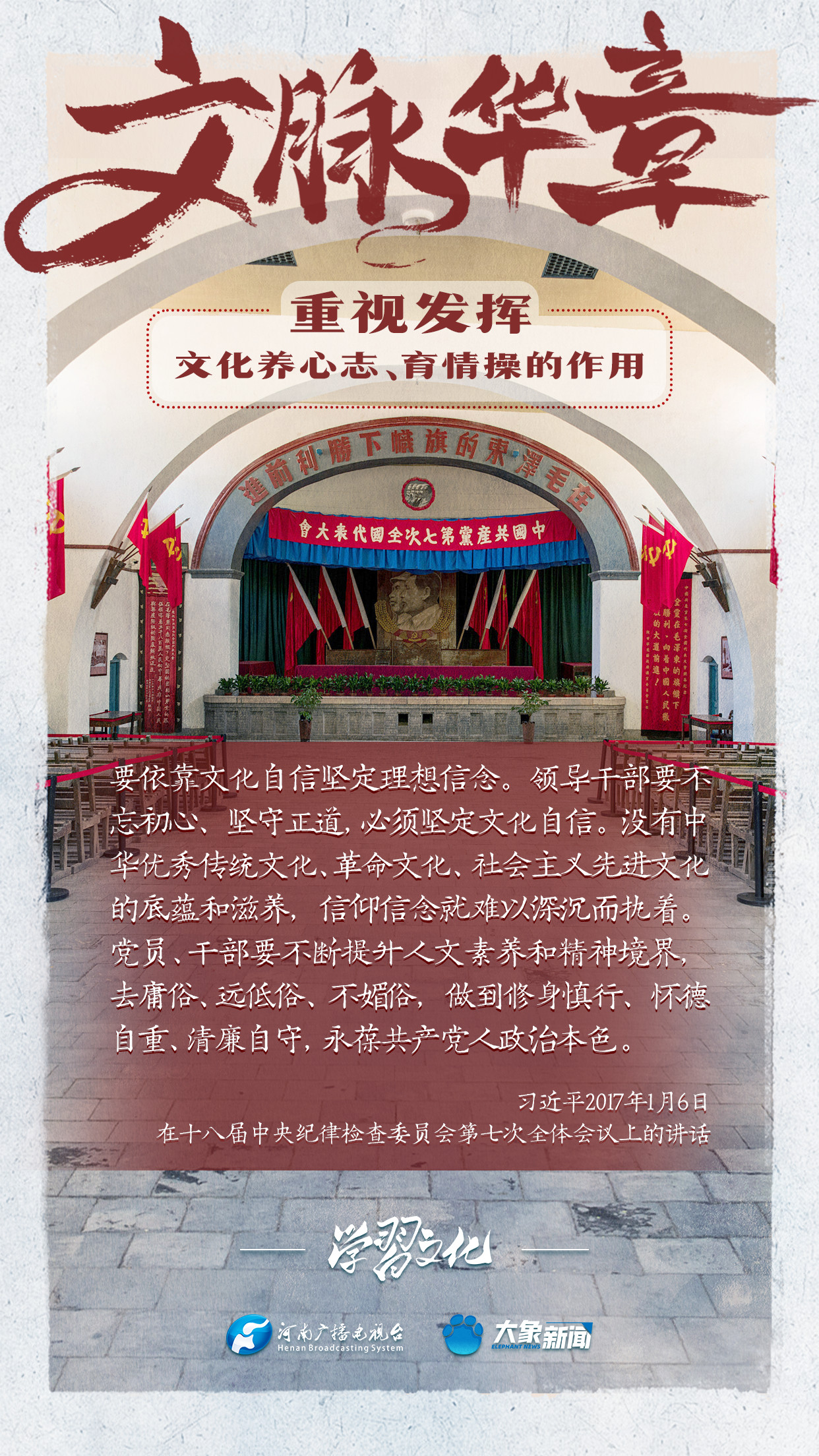 習(xi) 近平總書(shu) 記在主持中共中央政治局第十七次集體(ti) 學習(xi) 時強調,重視發揮文化養(yang) 心誌、育情操的作用,涵養(yang) 全民族昂揚奮發的精神氣質。總書(shu) 記高度重視文化的作用,發表了一係列重要講話,倡導以文載道、以文傳(chuan) 聲、以文化人。我們(men) 一起學習(xi) 。