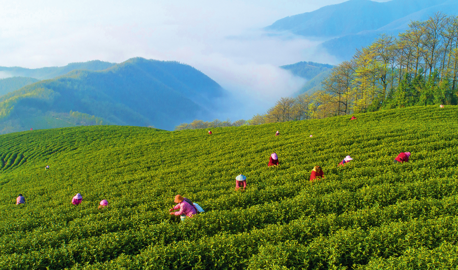 茶工在浙江省湖州市安吉縣杭垓鎮的生態茶園裏采摘明前茶(2023年4月2日攝)夏鵬飛 攝