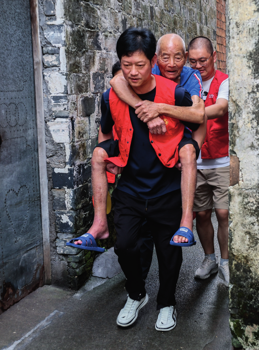 浙江省諸暨市趙家鎮泉畈村村幹部和黨(dang) 員誌願者在台風來臨(lin) 前轉移危舊房裏的老人(2024年9月19日攝)徐昱 攝