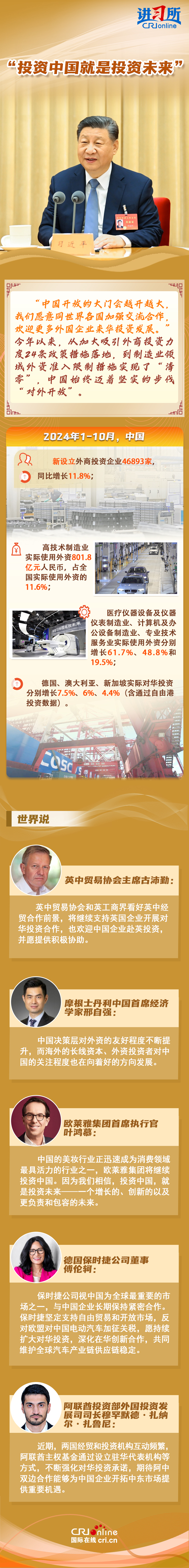 “中國是實幹家、行動派。”今年以來,從(cong) 習(xi) 近平主席的歐洲之行到拉美之行,再到四天前在北京會(hui) 見主要國際經濟組織負責人,習(xi) 近平一直強調,中國的發展將給世界帶來巨大機遇。據聯合國貿易和發展會(hui) 議不久前發布的《世界投資報告2024》中文版顯示,中國吸引外資的結構不斷優(you) 化、質量不斷提高,多位政商界人士也認為(wei) 中國是一個(ge) 非常有前景的市場,投資中國就是投資未來。