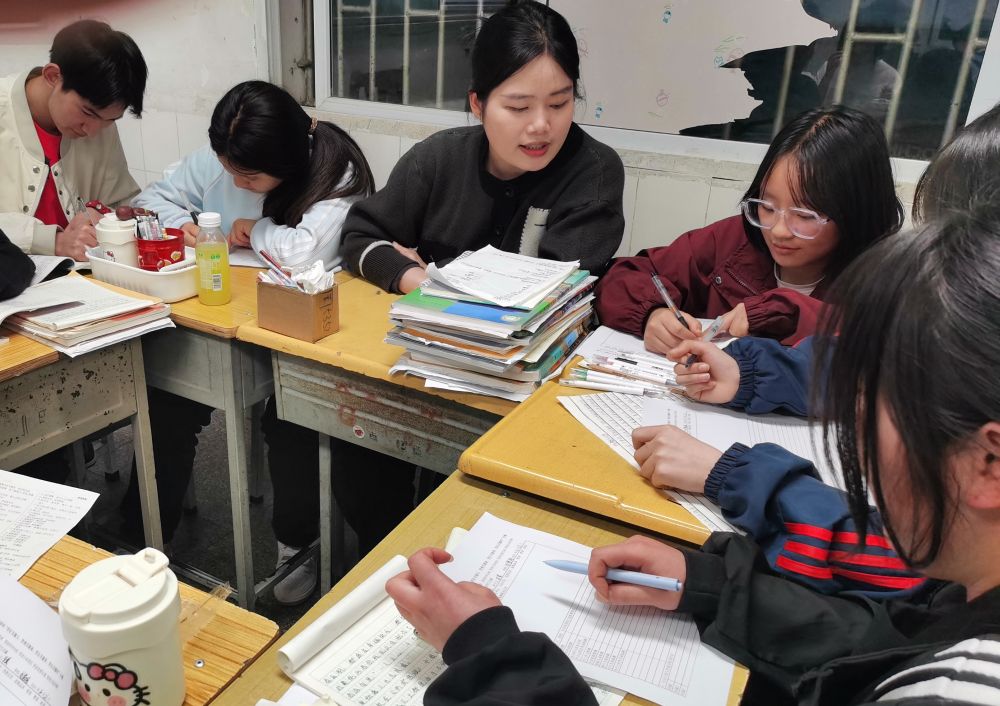 2024年4月21日,雲(yun) 南昭通大關(guan) 一中教師劉雪瑤(左三)在輔導學生做作業(ye) 。(李龍強 攝)