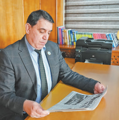 蘇赫羅普·勞夫佐達閱讀塔吉克斯坦《人民論壇報》與(yu) 中國相關(guan) 的報道。劉帥傑攝
