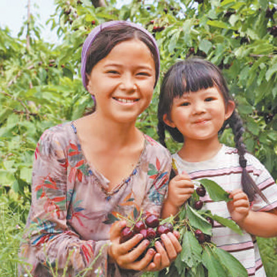 在中塔合建的吉薩爾櫻桃園,當地小女孩展示剛摘下的櫻桃。本報記者 顏歡攝