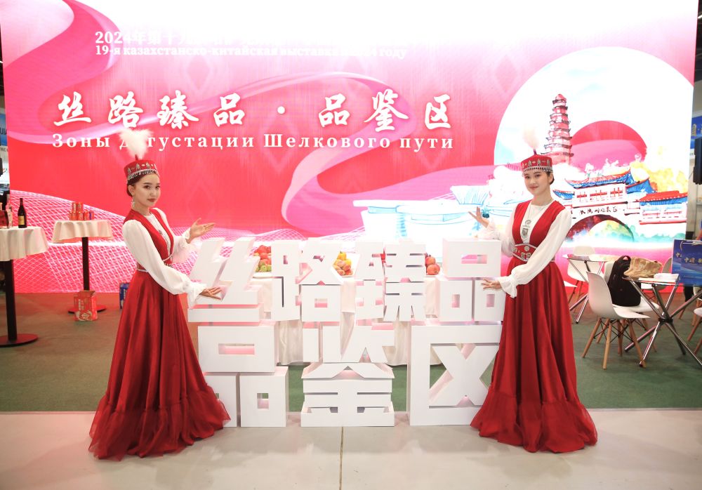 2024年8月23日,在哈薩克斯坦阿斯塔納,身著民族服飾的工作人員在第十九屆哈薩克斯坦—中國商品展覽會(hui) 上歡迎觀展民眾(zhong) 。新華社發(奧斯帕諾夫攝)