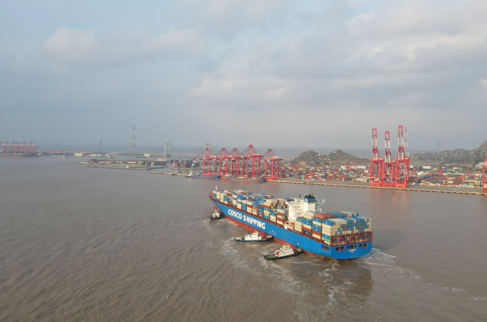 “新上海”輪抵達洋山港,這是自秘魯錢凱港開港後首個(ge) “錢凱—上海”正式航次(2024年12月18日攝,無人機照片)。新華社記者 方喆 攝