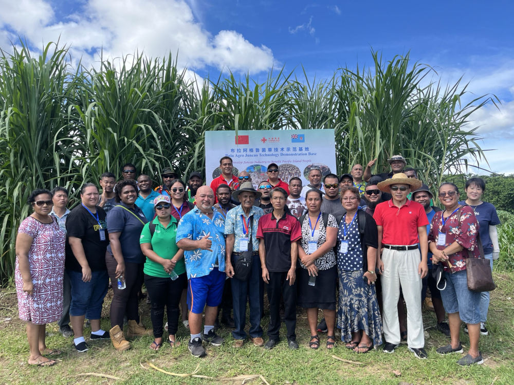 2024年2月28日,來自巴布亞(ya) 新幾內(nei) 亞(ya) 、湯加、庫克群島、薩摩亞(ya) 、瑙魯等國家的“太平洋島國菌草技術培訓班”學員在斐濟布拉阿格魯菌草技術示範基地合影。新華社發(中國援斐濟菌草技術示範中心供圖)