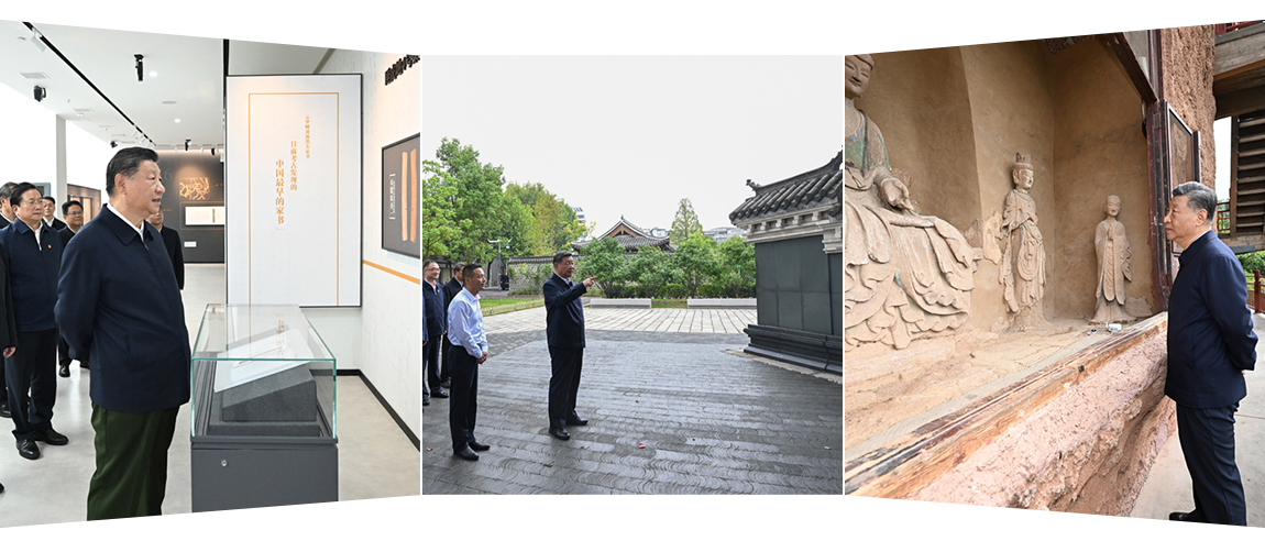 自左向右分別為(wei) :2024年11月4日,習(xi) 近平總書(shu) 記在湖北孝感雲(yun) 夢縣博物館參觀出土秦漢簡牘展;2024年10月17日,習(xi) 近平總書(shu) 記在安徽桐城六尺巷考察;2024年9月11日,習(xi) 近平總書(shu) 記在甘肅天水麥積山石窟考察。