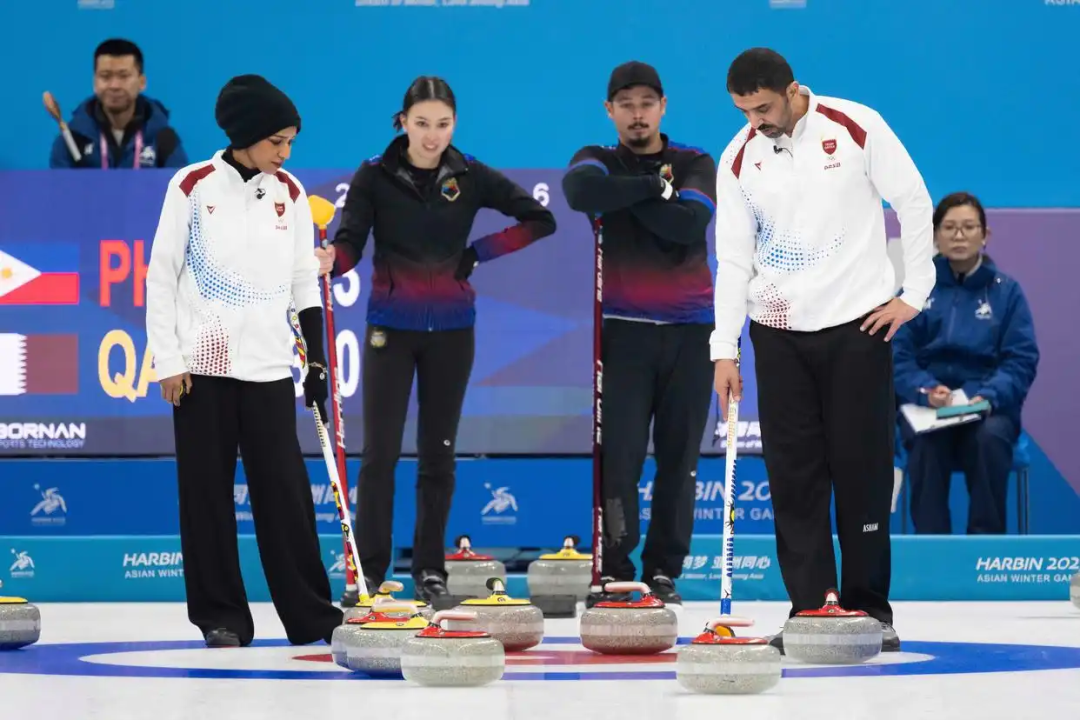 2月5日,亞(ya) 冬會(hui) 冰壺混雙循環賽B組第3輪比賽中,菲律賓隊11比3戰勝卡塔爾隊。