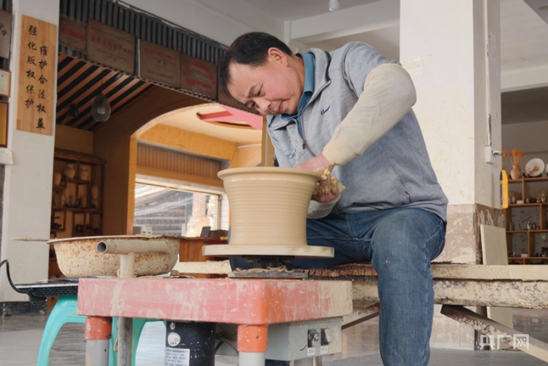 母先才在自己的陶藝館內(nei) 製作盬子(央廣網記者 欒小琳 攝)