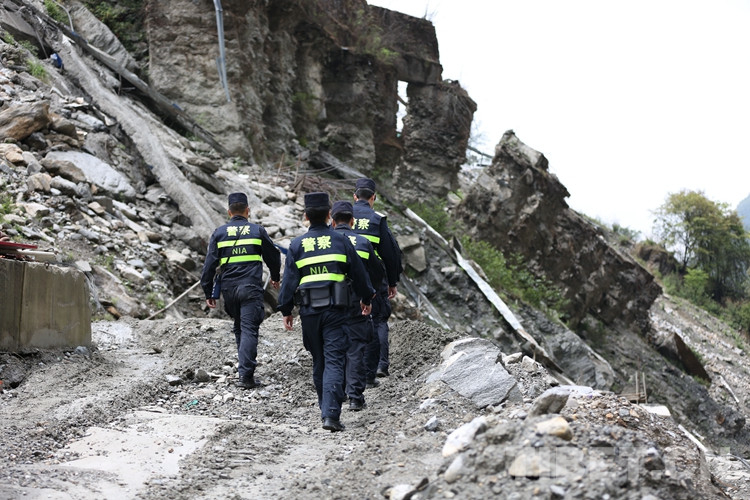 圖為(wei) 屈鵬帶領所屬民警在口岸泥石流地段進行巡邏