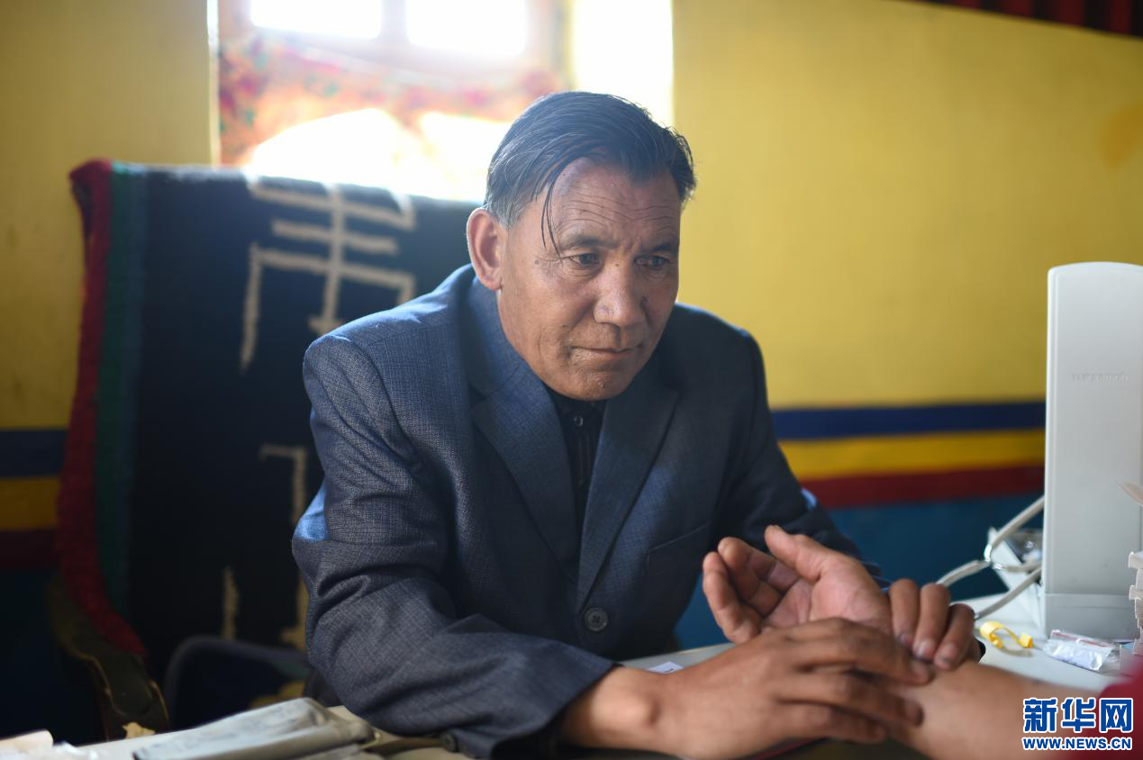 圖為(wei) 西藏阿裏岡(gang) 底斯藏醫教學院校長才丹多吉在為(wei) 患者把脈(4月20日攝)。新華網 旦增努布攝