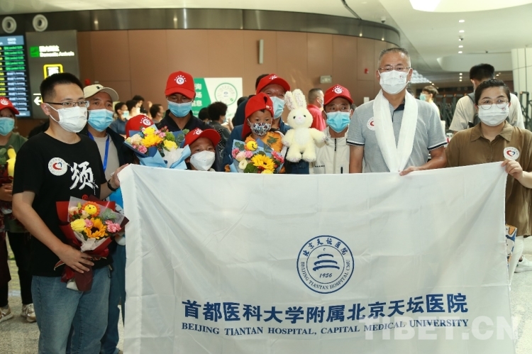 圖為(wei) 7月24日即將前往首都醫科大學附屬北京天壇醫院的患兒(er) 、家屬及院方代表
