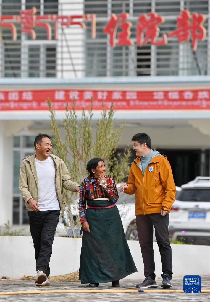 7月31日,在阿裏地區人民醫院,中國醫學科學院整形外科醫院醫生王克明(右)和西藏自治區人民醫院醫生旦增念紮(左)陪伴即將做手術的牧民巴吉放鬆散步。新華社記者 張汝鋒 攝