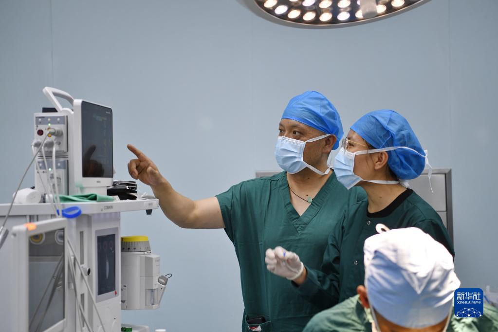 7月31日,在阿裏地區人民醫院手術室,西藏自治區人民醫院麻醉科醫生達娃吾珠(左一)指導當地麻醉醫生旦增次白進行麻醉監測。新華社記者 張汝鋒 攝