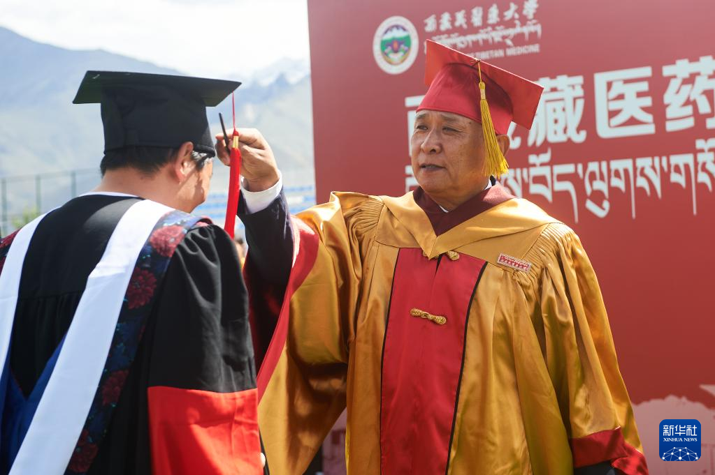 6月21日,西藏藏醫藥大學校長、博士生導師米瑪為(wei) 2023屆畢業(ye) 生撥流蘇。新華社記者 旦增尼瑪曲珠 攝
