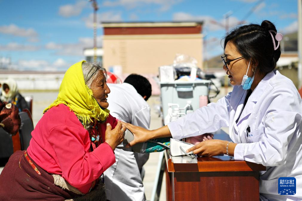8月18日,在阿裏地區措勤縣曲洛鄉(xiang) ,鄉(xiang) 衛生院醫生巴桑卓瑪為(wei) 一名老人測量血壓。新華社記者 張汝鋒 攝