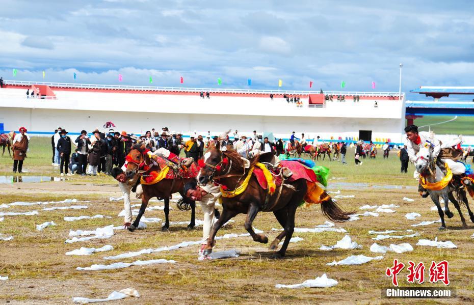 8月11日,藏北騎手表演跑馬拾哈達。8月10日,2020年那曲羌塘恰青格薩爾賽馬藝術節在西藏那曲市開幕。中新社記者 張偉(wei) 攝
