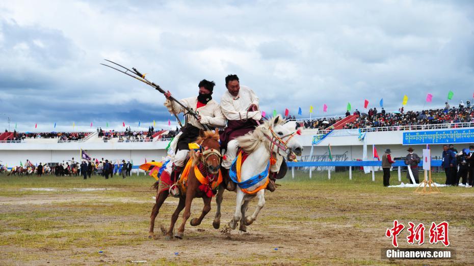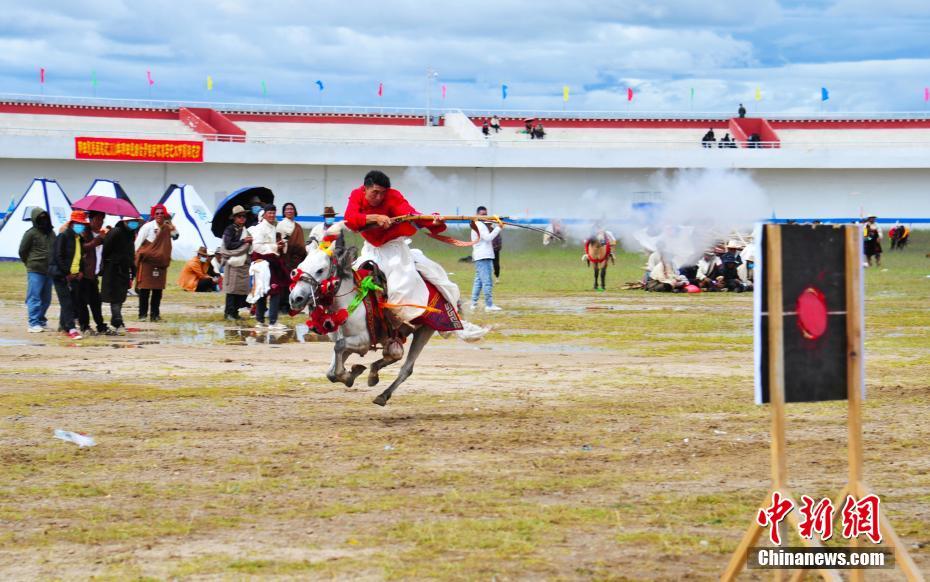 8月11日,藏北騎手表演跑馬射擊。8月10日,2020年那曲羌塘恰青格薩爾賽馬藝術節在西藏那曲市開幕。中新社記者 張偉(wei) 攝