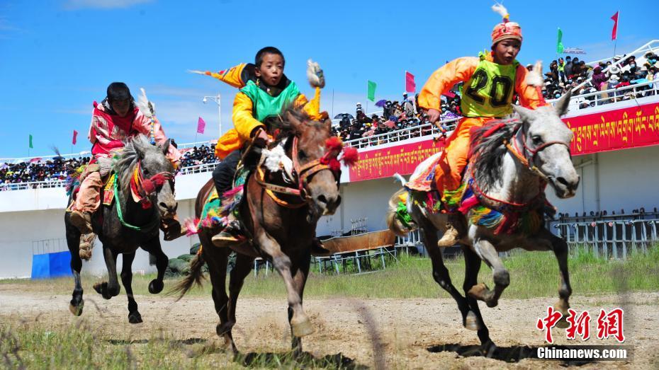 8月12日,2020年那曲羌塘恰青格薩爾賽馬藝術節在西藏那曲舉(ju) 行,參賽選手均為(wei) 9至14歲的少年騎手。圖為(wei) 騎手參加8000米場內(nei) 速度賽馬比賽。中新社記者 張偉(wei) 攝