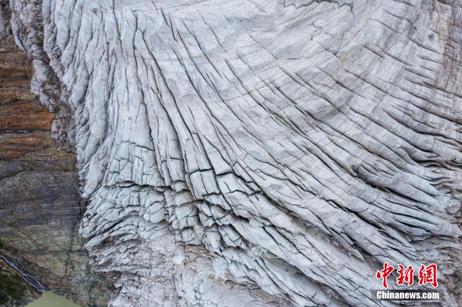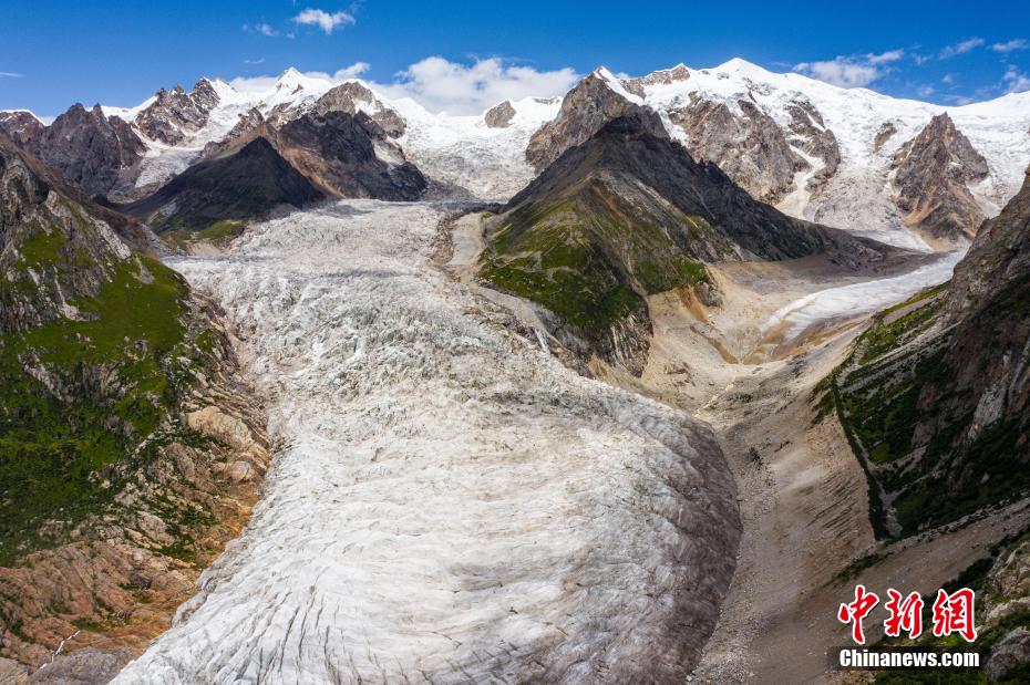 約雄冰川距離巴青縣城約85公裏,冰川所在區域屬於(yu) 國家級濕地保護區,主要由冰川下遊冰緣區的湖泊水域、河流、沼澤化草甸及流域匯水區的部分水源林地組成。圖為(wei) 航拍約雄冰川。 何蓬磊 攝