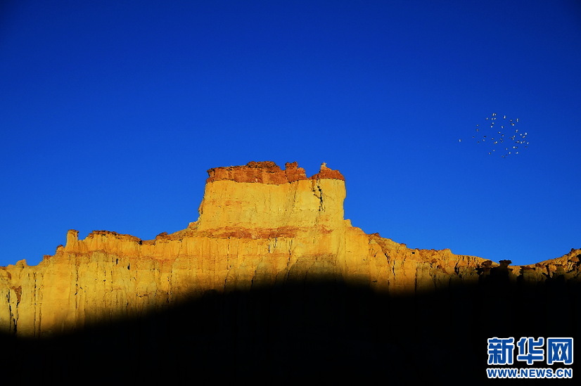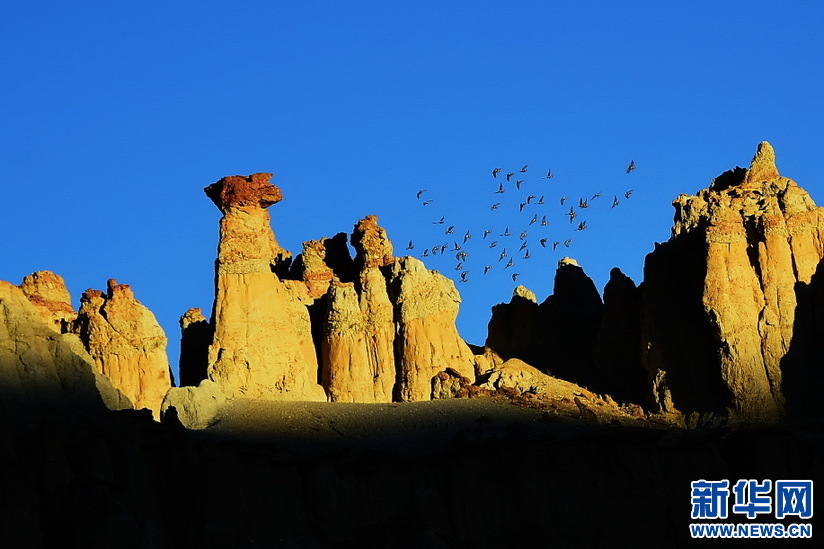 一群鳥兒(er) 飛過朝陽照耀下的土林(10月17日攝)。新華網 張宸攝