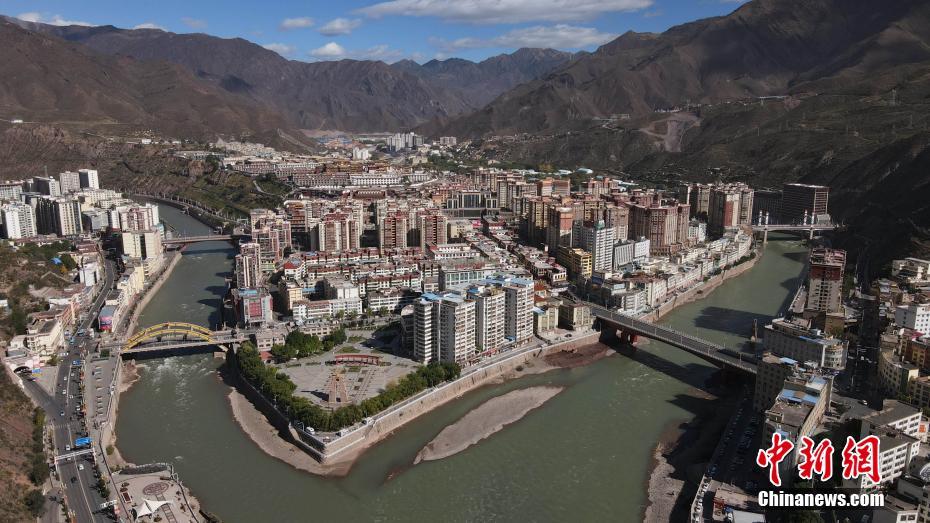 圖為(wei) 航拍昌都城。瀾滄江正源紮曲河與(yu) 昂曲河在此交匯為(wei) 瀾滄江。中新社記者 蘇丹 攝