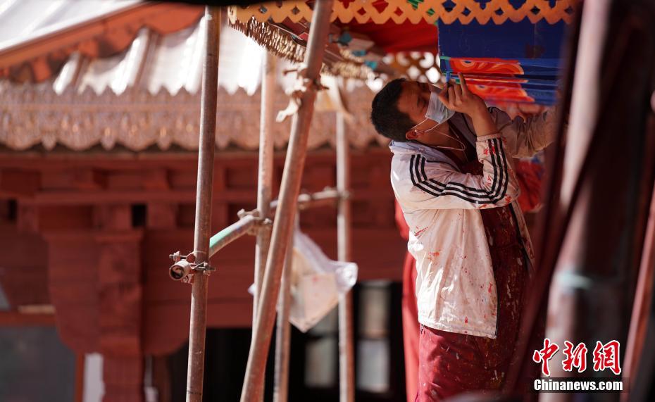 圖為(wei) 強巴寺的僧人在刷新房屋。中新社記者 蘇丹 攝