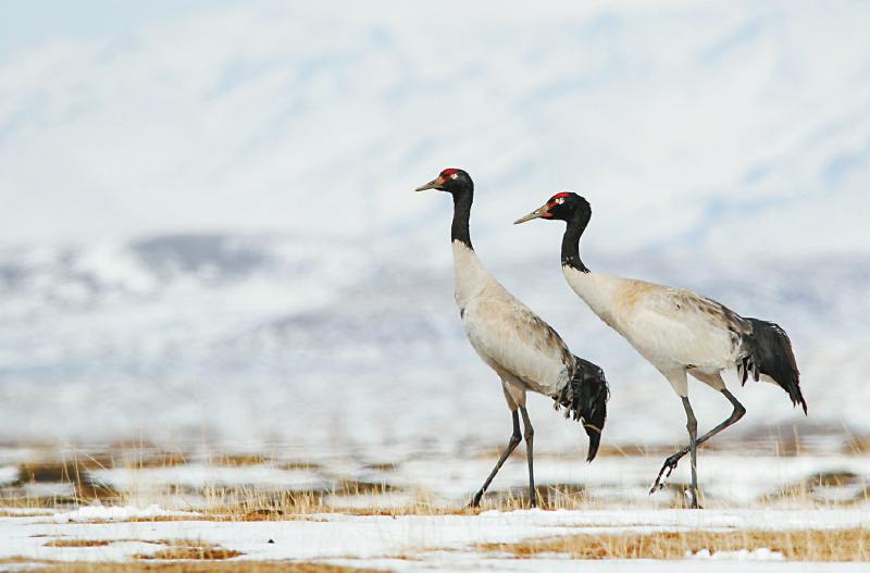 據觀鳥人員介紹,雌雄黑頸鶴一旦結合,就會終身廝守,朝夕相伴。如果一位伴侶死亡,那麽另一半要麽憂鬱而亡,要麽終身形單影隻,絕不會再和其它黑頸鶴交配。[詳細]