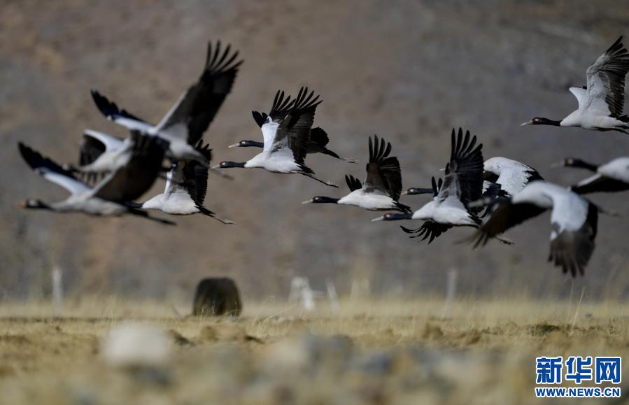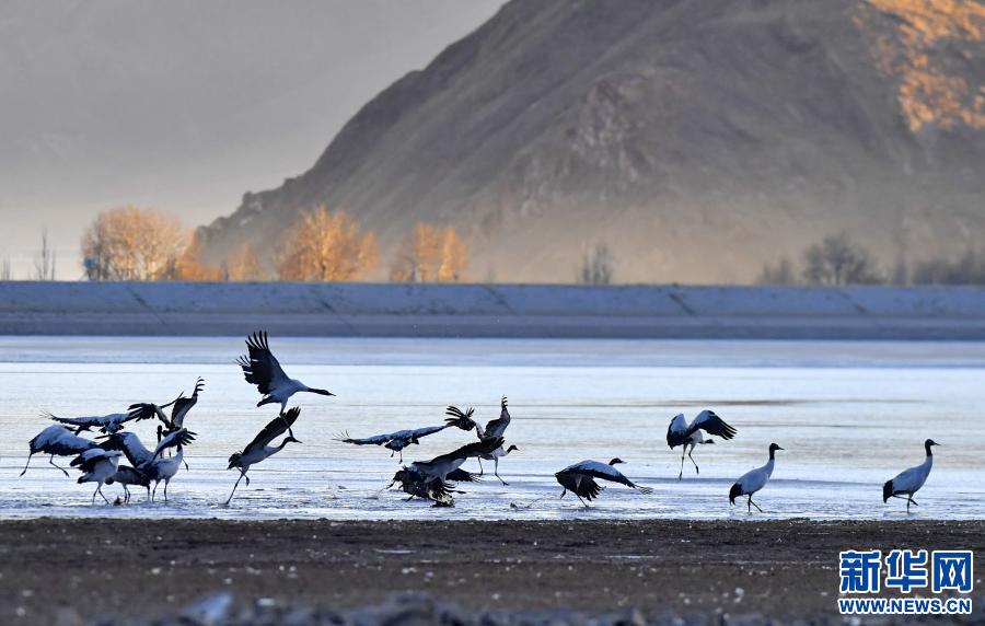 冬日,大批黑頸鶴在西藏拉薩市林周縣境內(nei) 棲息、覓食。 林周縣黑頸鶴自然保護區建立於(yu) 1993年,2003年被設立為(wei) 國家級自然保護區,是雅魯藏布江中遊自然保護區的核心部分,在每年的11月底至12月初,這裏便會(hui) 迎來成群的黑頸鶴過冬。