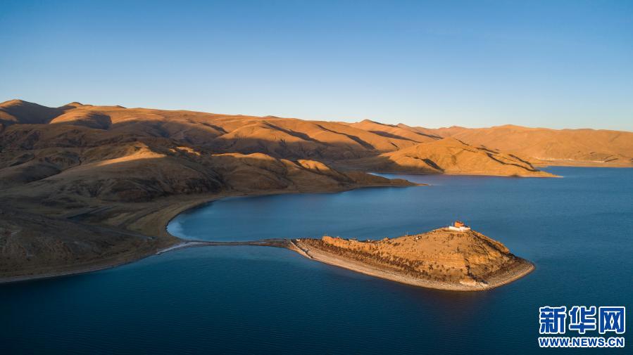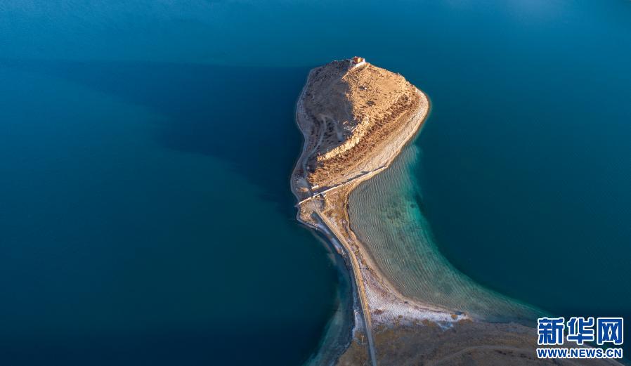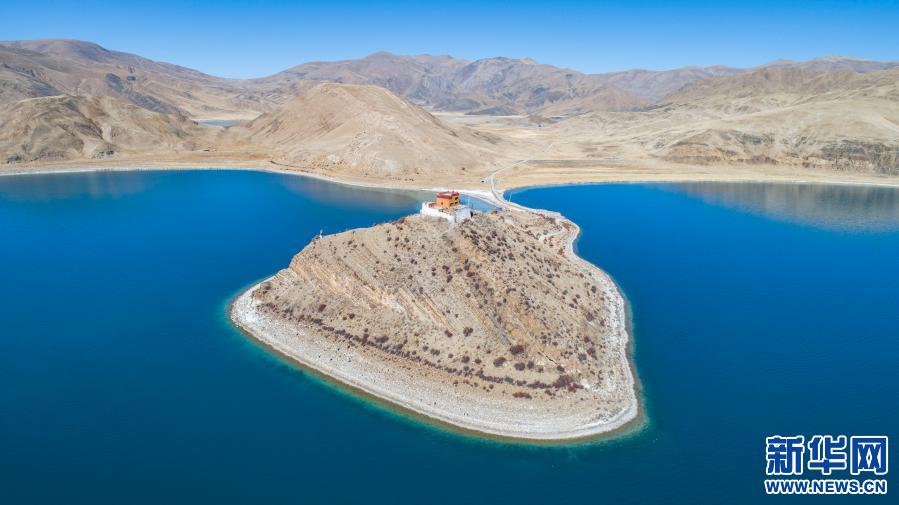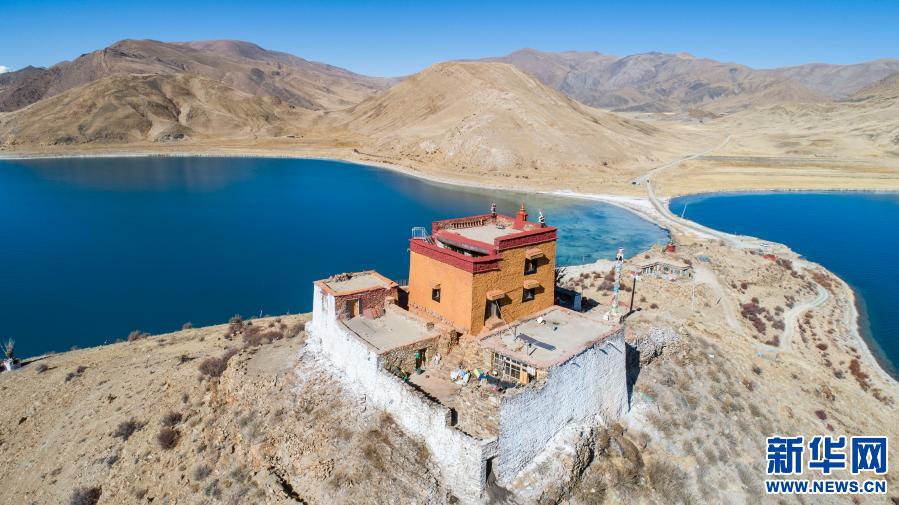 坐落於(yu) 羊湖北岸一座小島上的日托寺(無人機照片,1月10日攝)。新華社記者 孫非 攝