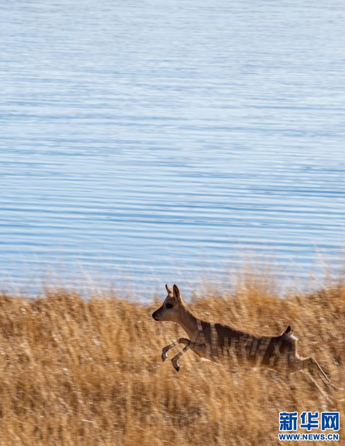 在羊湖岸邊草叢(cong) 裏奔跑的藏原羚(1月10日攝)。新華社記者 孫非 攝
