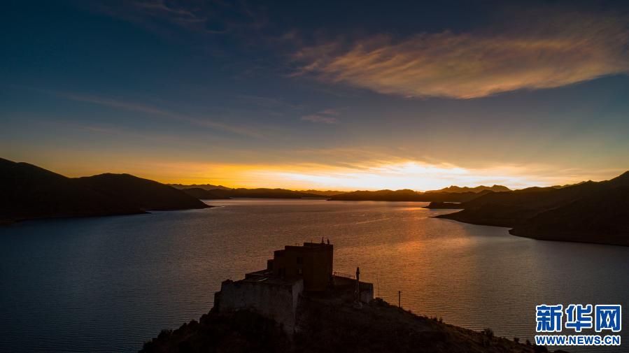 落日餘(yu) 暉下,日托寺的影子倒映在羊湖湖麵(無人機照片,1月9日攝)。新華社記者 孫非 攝