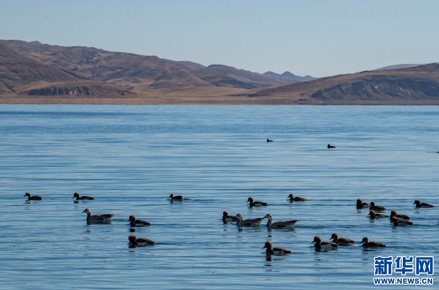 這是1月10日拍攝的羊卓雍錯湖麵上的水鳥。新華社記者 孫非 攝
