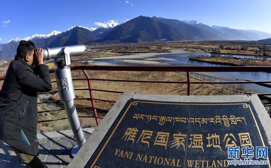 一名遊客借助望遠鏡觀看西藏雅尼國家濕地公園的景色(2月2日攝)。新華社記者 張汝鋒 攝