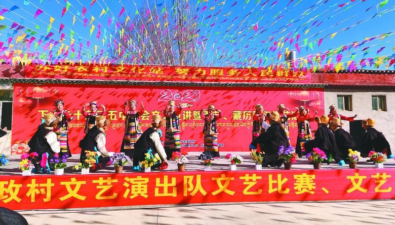 圖為(wei) 瓊結縣下水鄉(xiang) 各行政村文藝演出隊演職人員在組織開展春節、藏曆新年文藝演出活動。