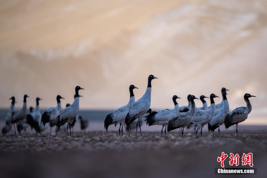 2月17日,西藏拉薩市林周縣黑頸鶴保護區內(nei) ,黑頸鶴嬉戲、覓食。中新社記者 何蓬磊 攝