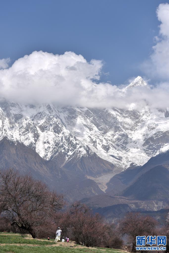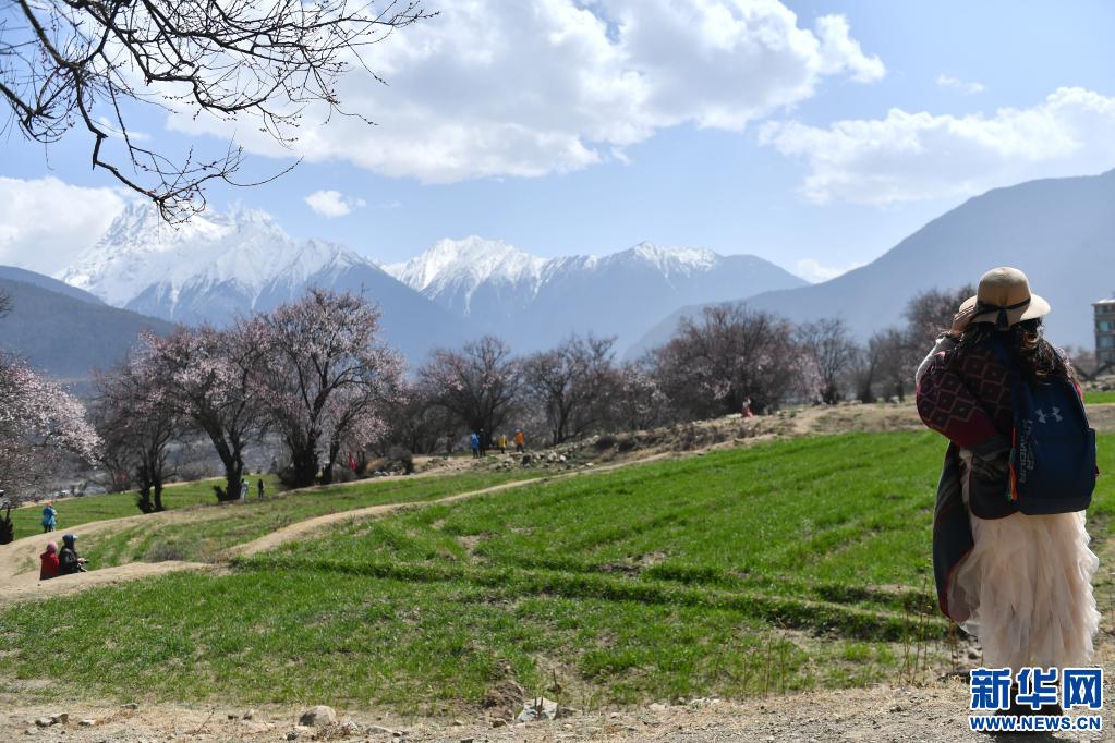 3月28日,遊客在西藏自治區林芝市索鬆村欣賞與(yu) 雪山相映的桃花。新華社記者 孫瑞博 攝