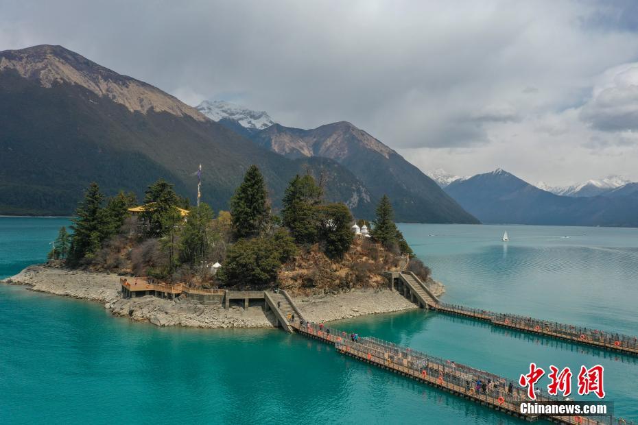 巴鬆措位於(yu) 西藏林芝,湖麵海拔3480米,是西藏海拔最低的大湖。湖水呈碧綠色,清澈透亮,四周環繞的雪山和樹木倒映其中,美不勝收。圖為(wei) 3月29日,遊客在紮西島遊玩。(無人機拍攝)中新社發 貢嘎來鬆 攝