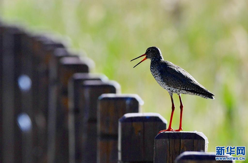 在拉魯濕地人行步道欄杆上鳴叫的紅腿鷸(6月2日攝)。新華社記者 張汝鋒 攝